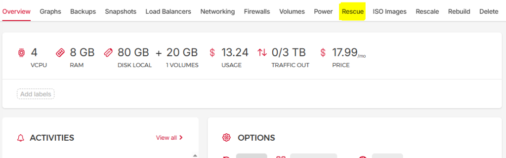 After the rescale completed, my VPS wouldn’t boot. Instead, I was greeted with a rescue mode screen and what looked like a complete system failure.